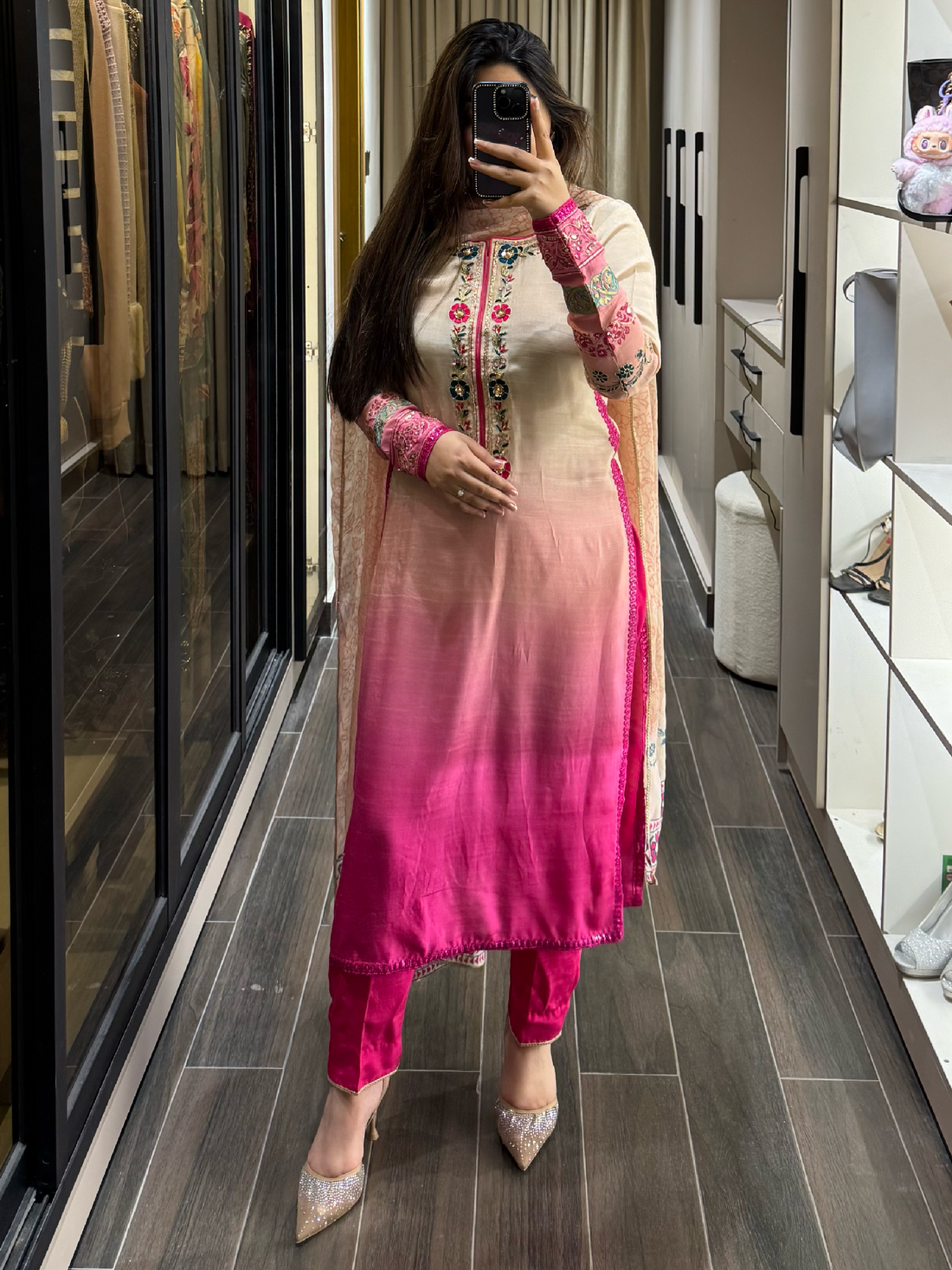 Stitched Bottle Green & Pink Shaded Dupatta Raw Silk Suit