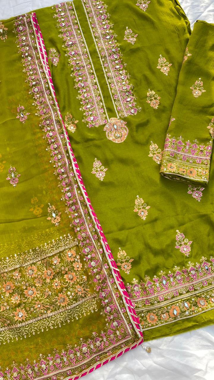 Parrot Green Embellished Raw Silk Set