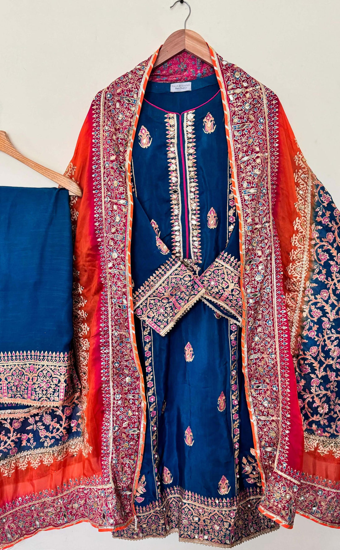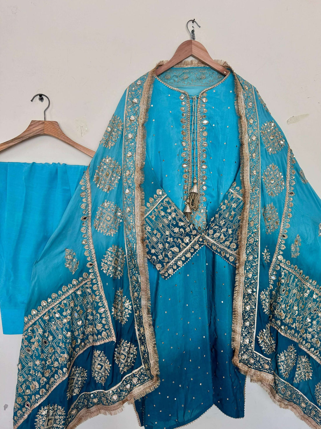 Stitched Teal Three Shaded Dupatta Raw Silk Suit