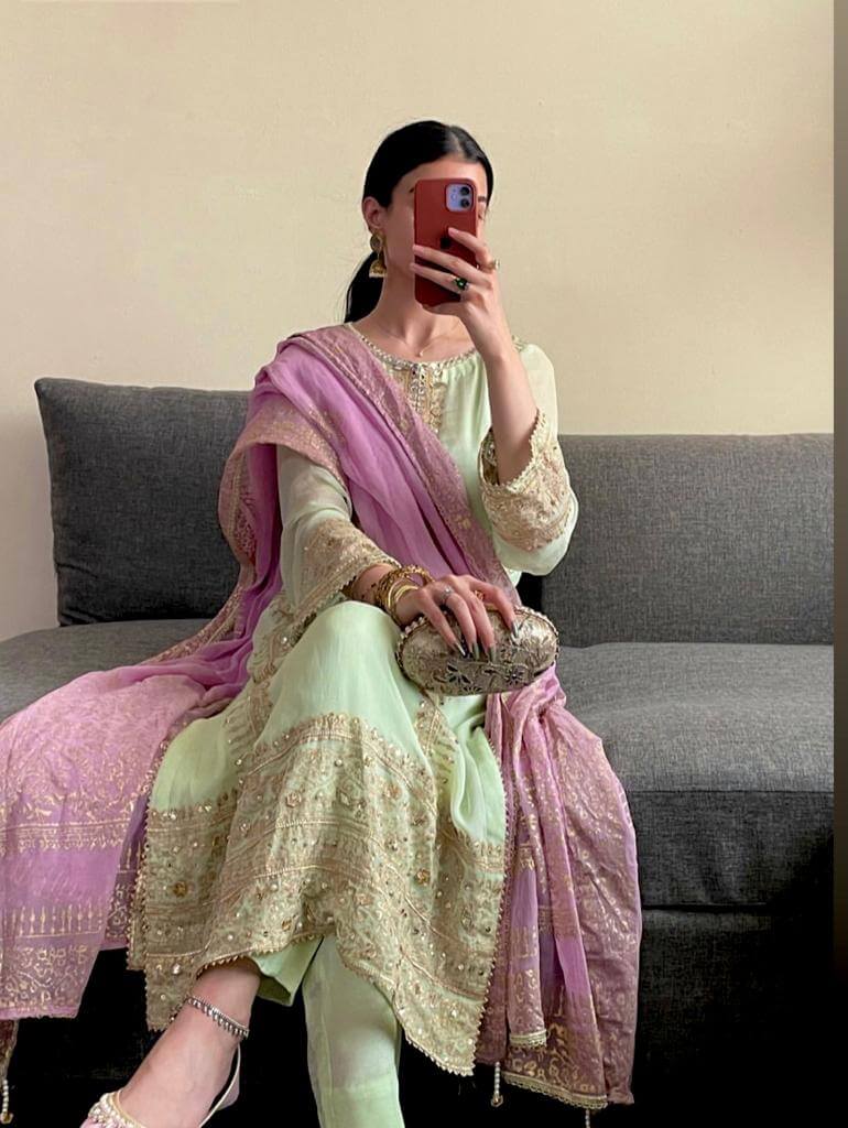 Stitched Mint Green & Lilac Embellished Chiffon Suit