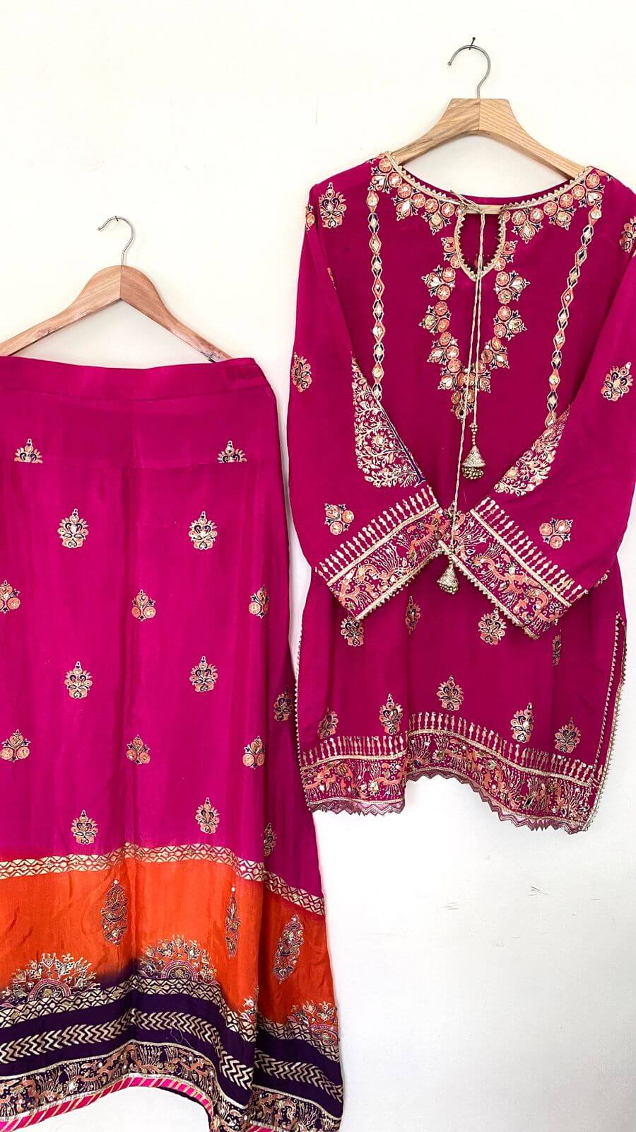 Stitched Pink Embellished Lawn Suit With Two-Shaded Dupatta & Sharara Pants