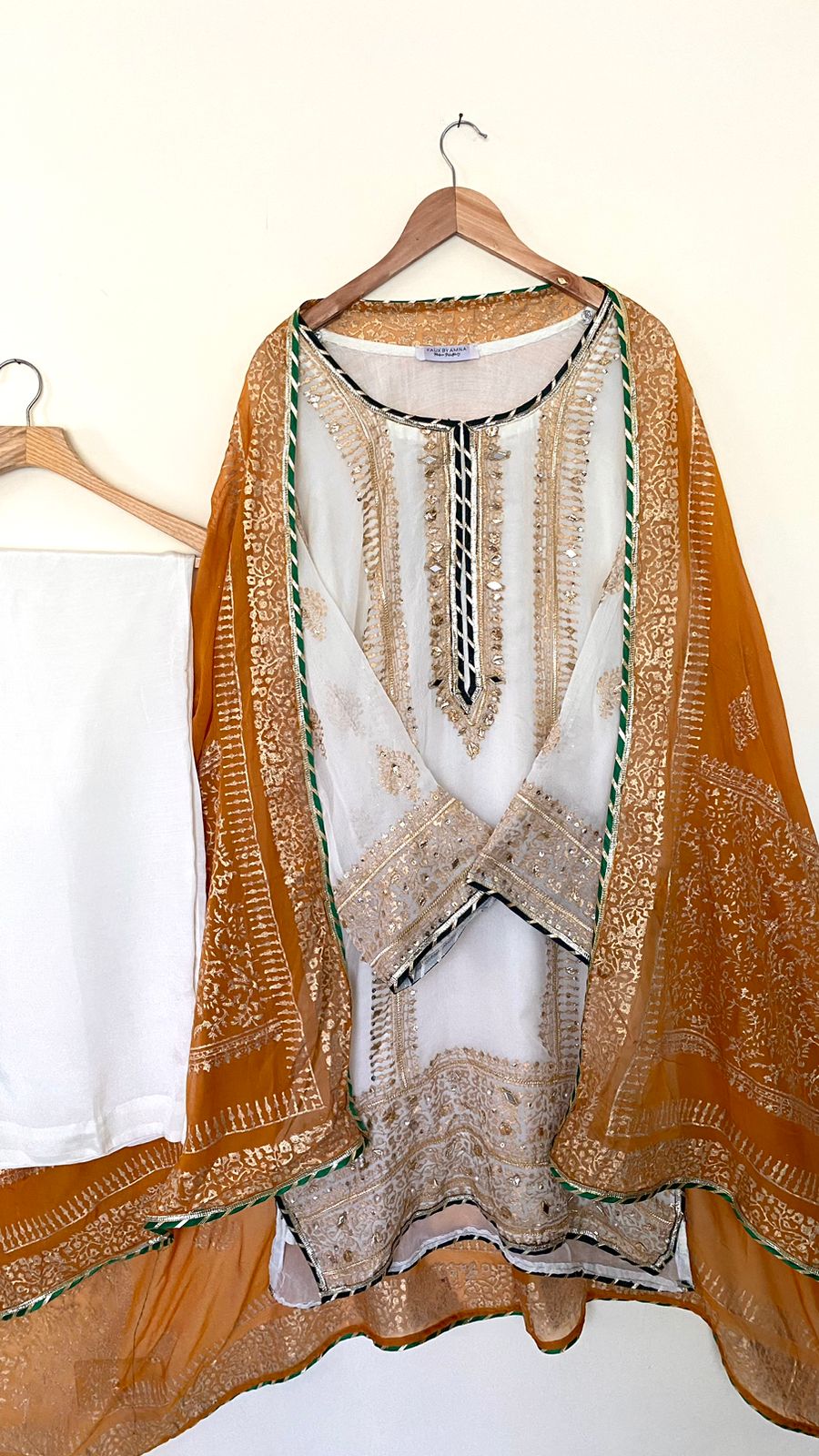 Stitched Off-White & Mustard Embellished Chiffon Suit