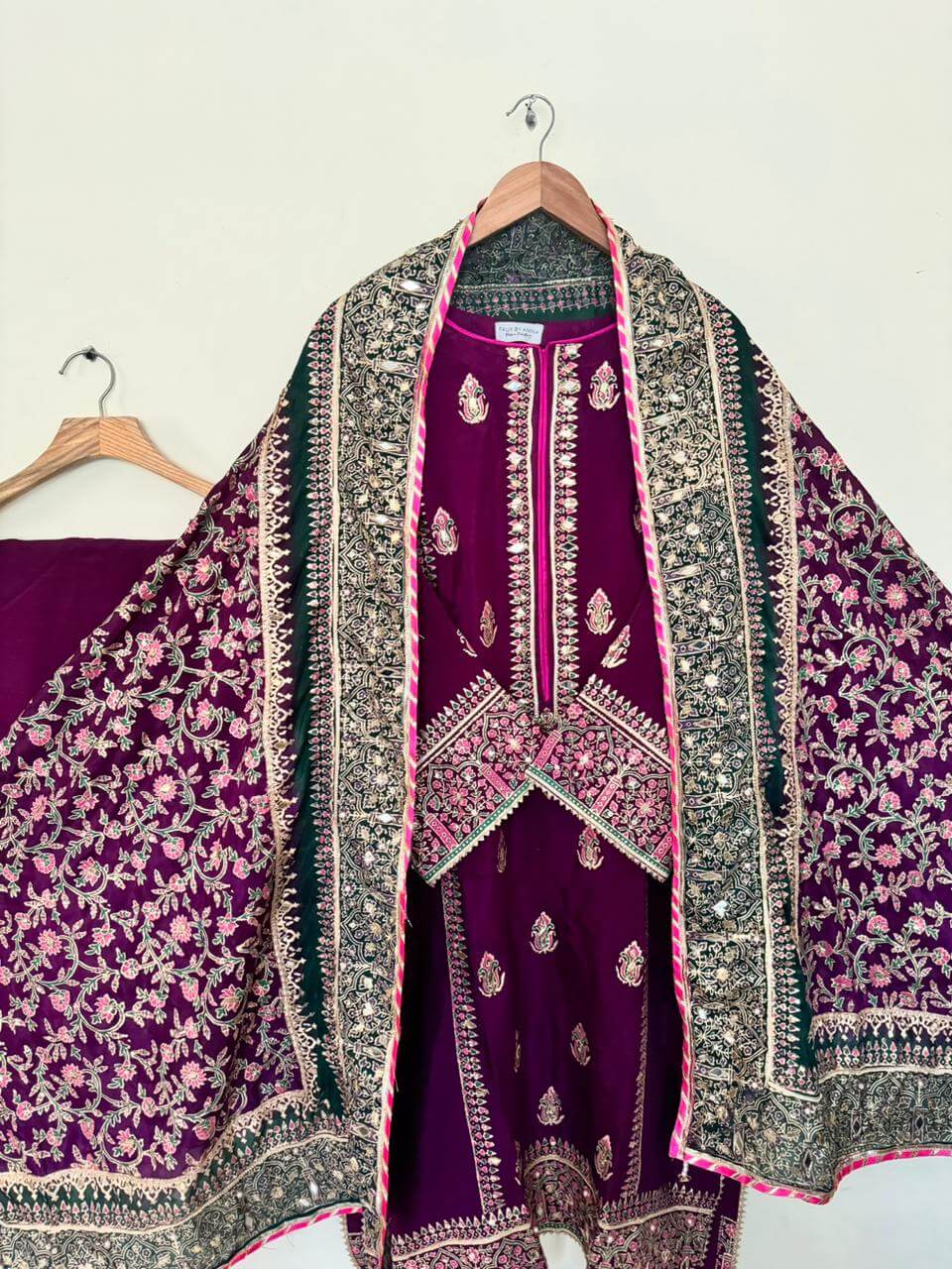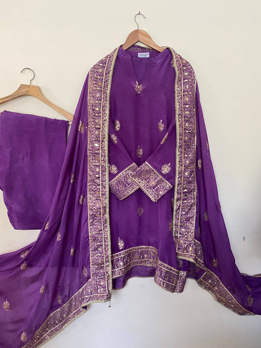 Stitched Violet Three Shaded Dupatta Raw Silk Suit