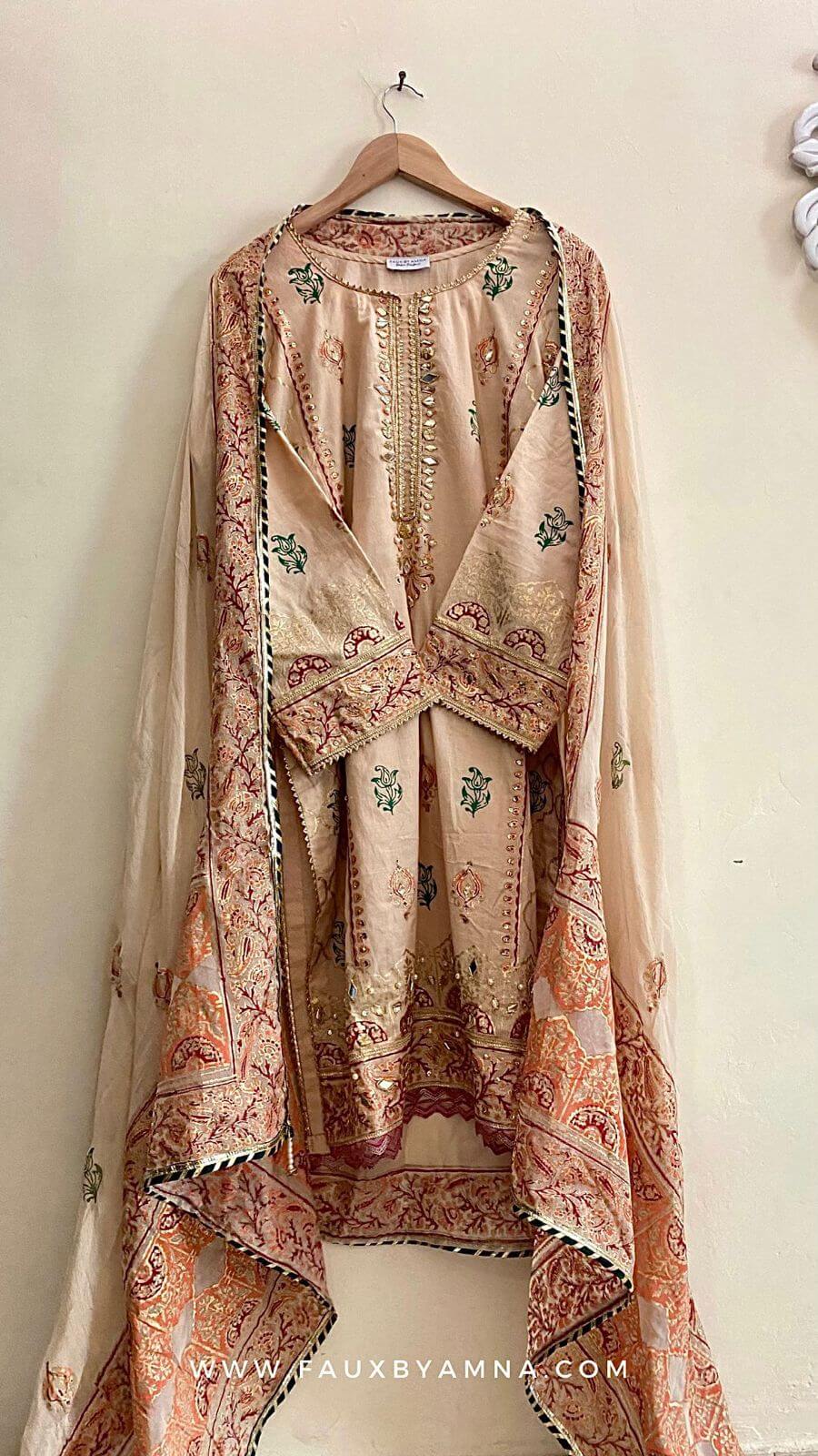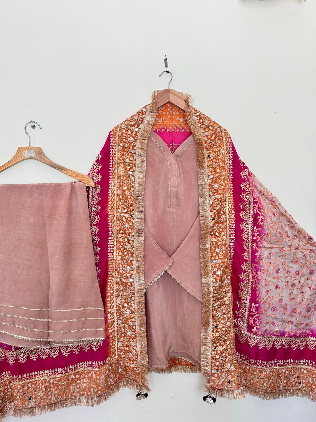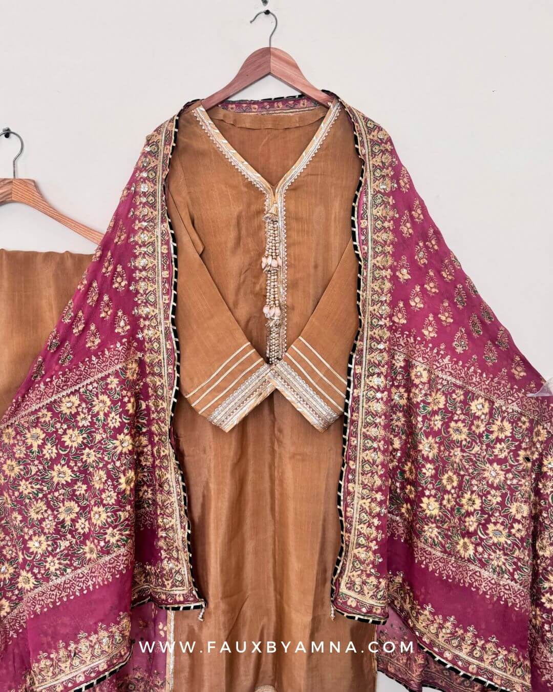 Stitched Dark Beige & Pink Shaded Dupatta Raw Silk Suit