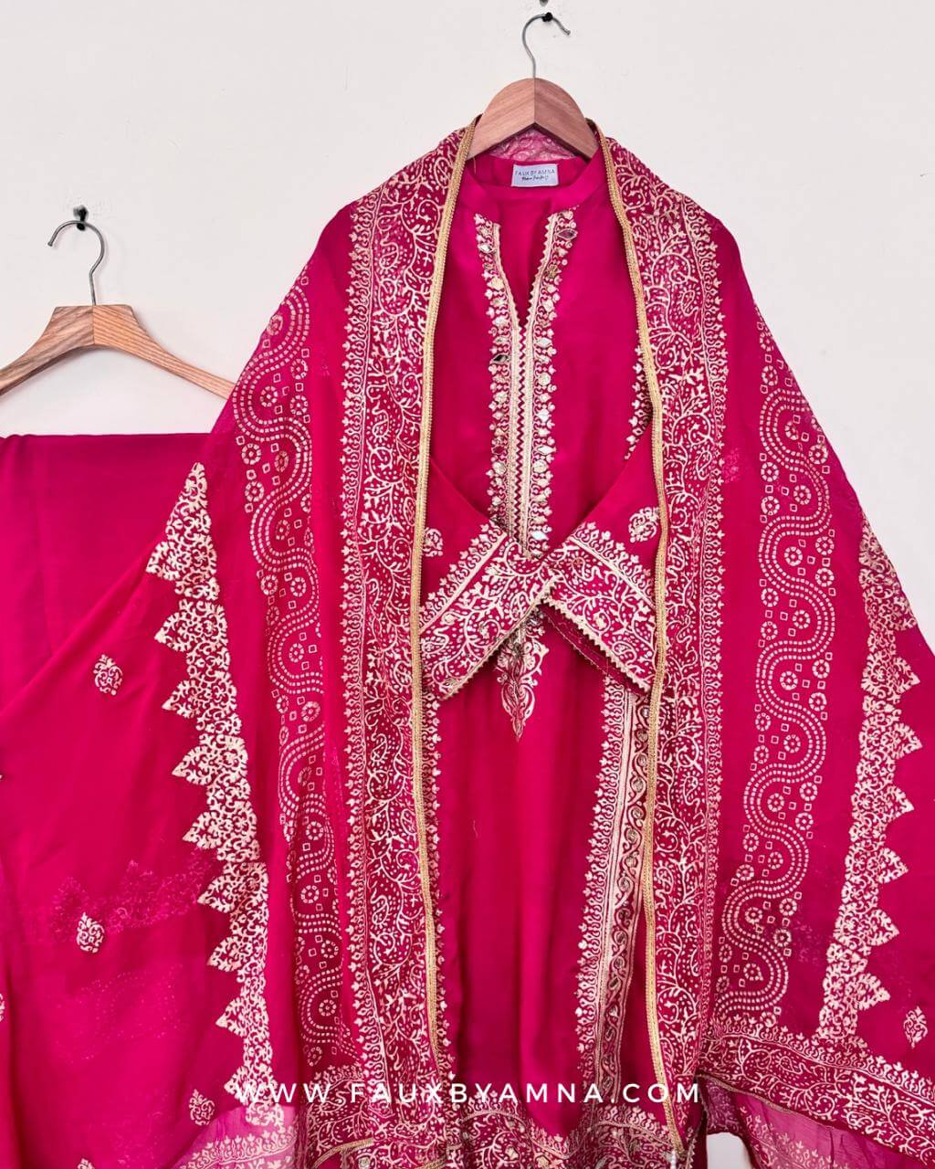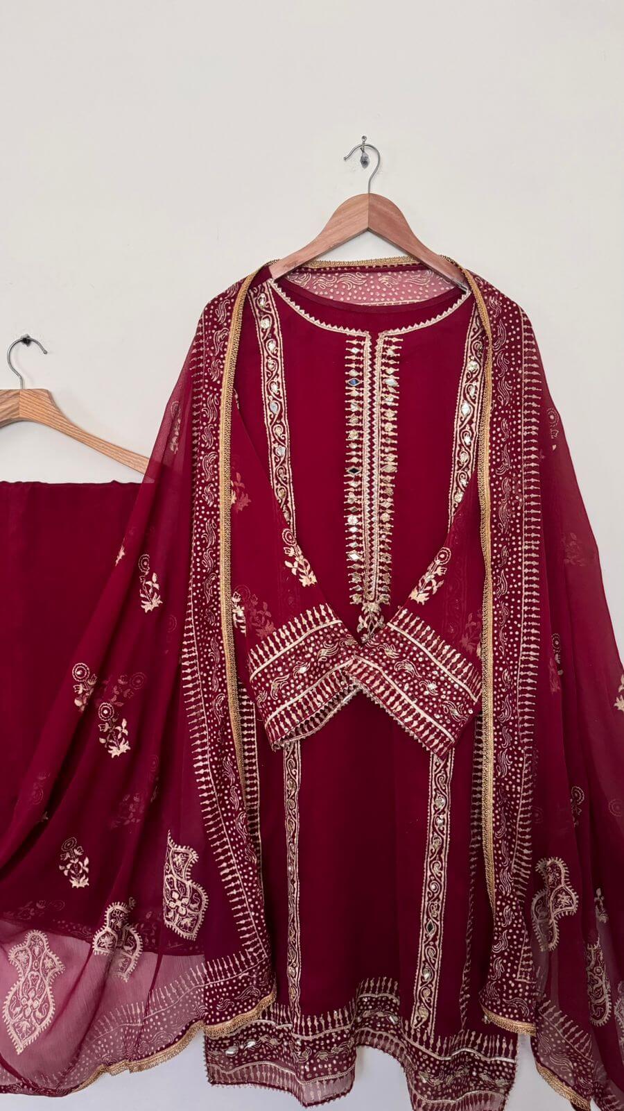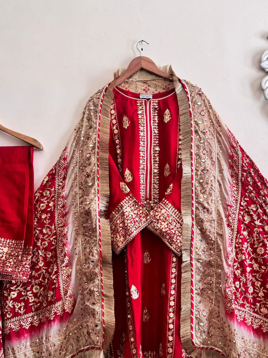 Stitched Blood Red Three Shaded Dupatta Raw Silk Suit