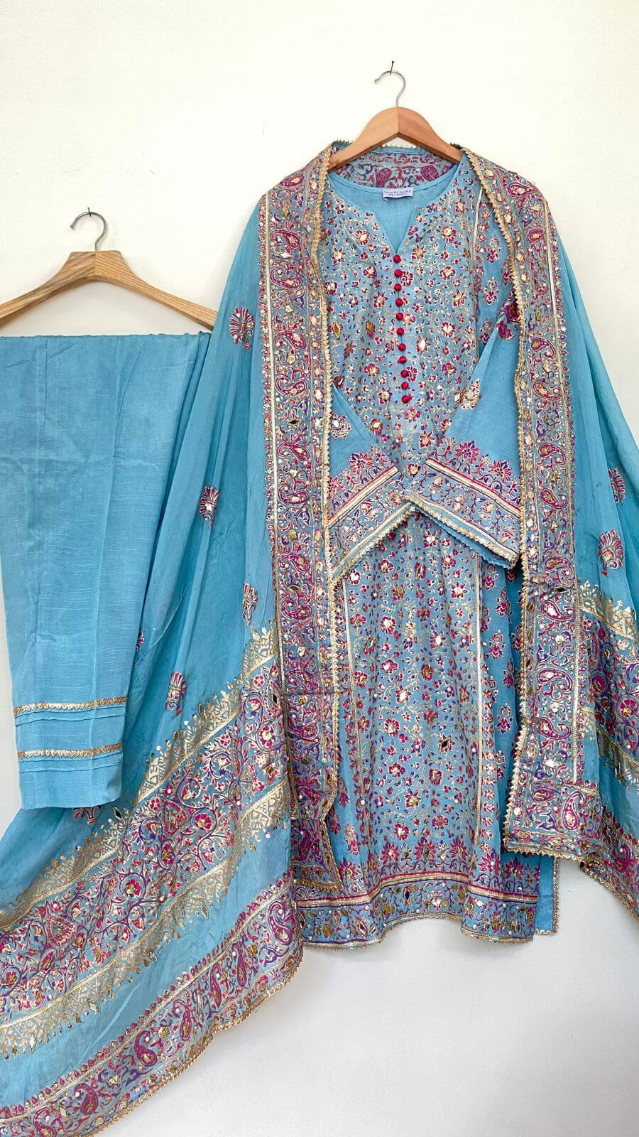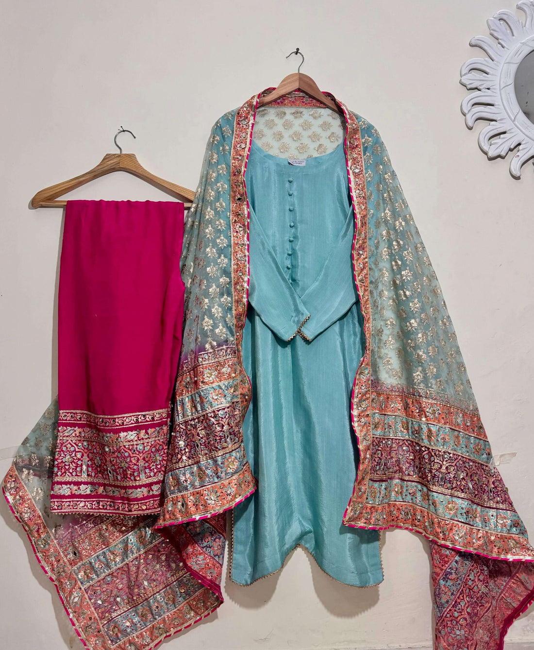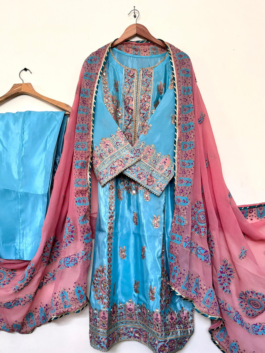 Stitched Ice Blue & Pink Shaded Dupatta Raw Silk Suit