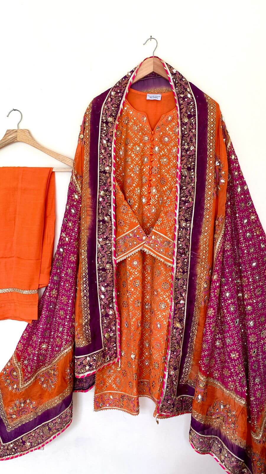 Stitched Burnt Orange & Three Shaded Dupatta Raw Silk Suit