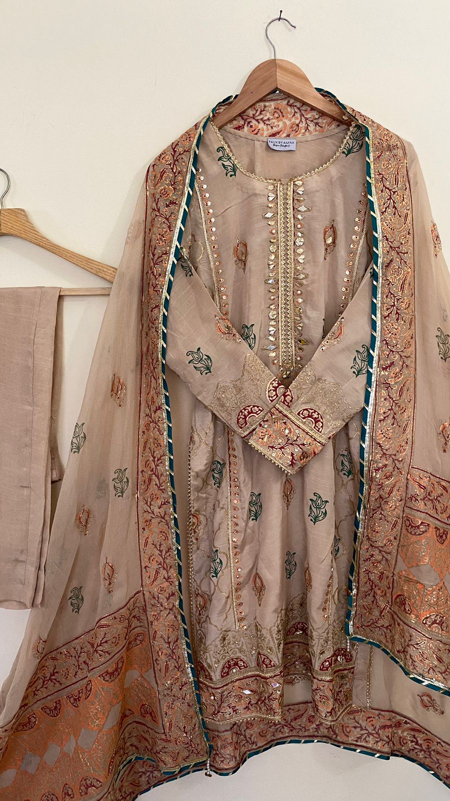 Fabric: Raw Silk Shirt, Raw Silk pants, Chiffon RTW Dupatta. No. of pieces: 3 pc (Embellished...