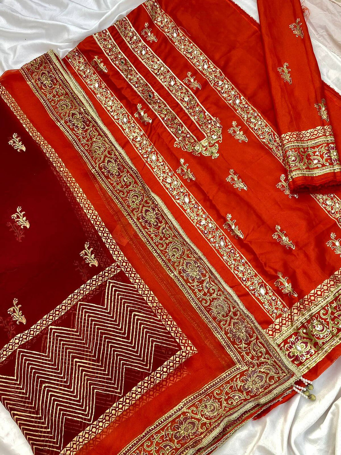 Shocking Pink Embellished Katan Silk/Raw Silk Set With Two-Shaded Dupatta