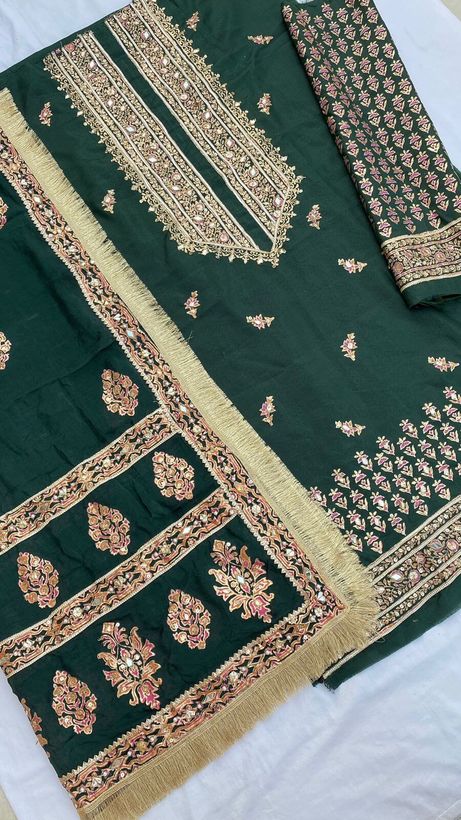 Embellished Katan Silk Bottle Green Suit With Silk Dupatta