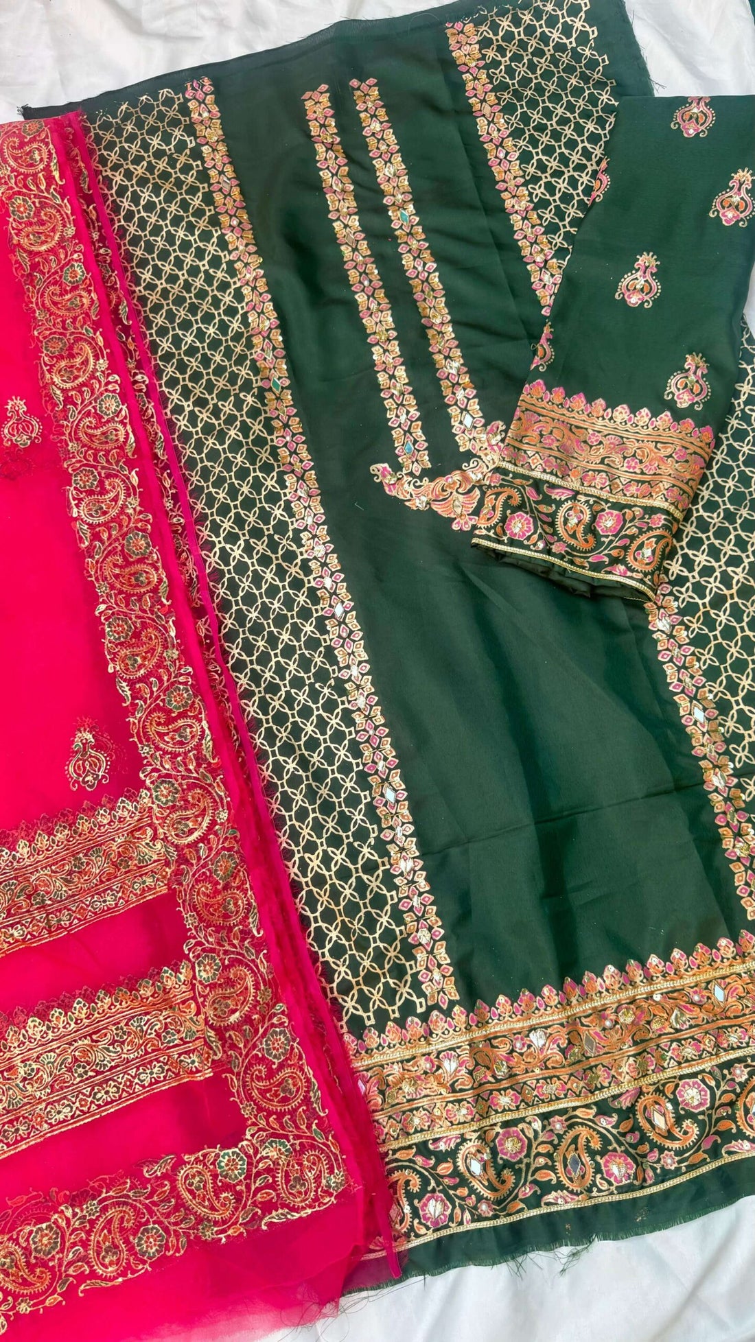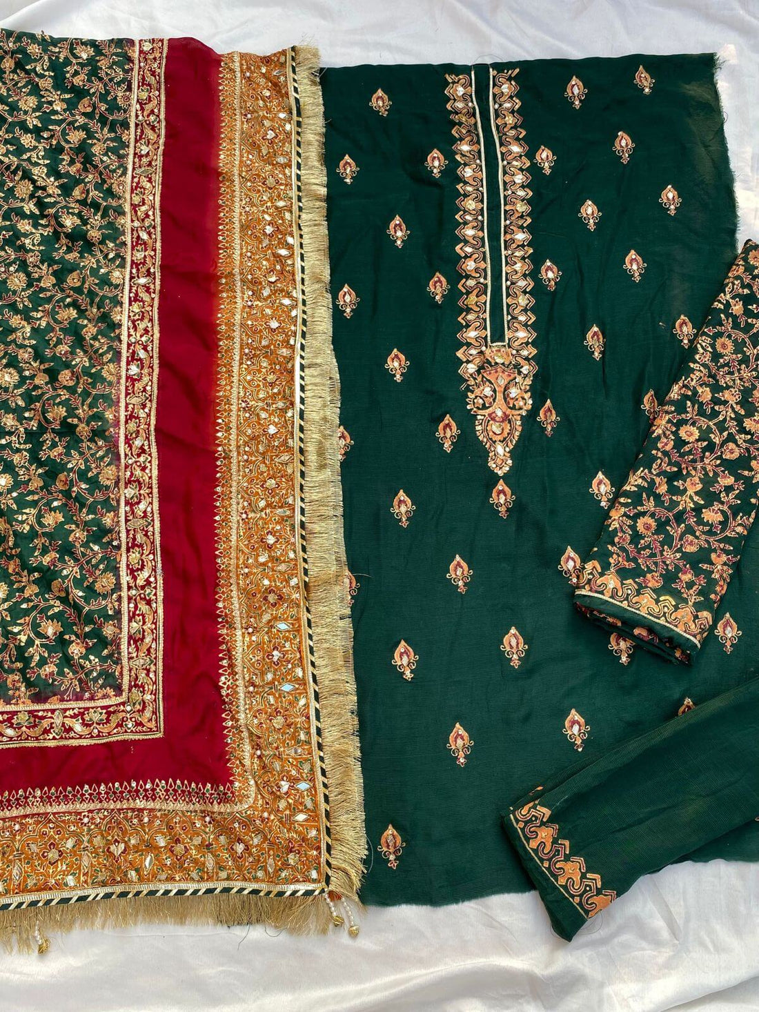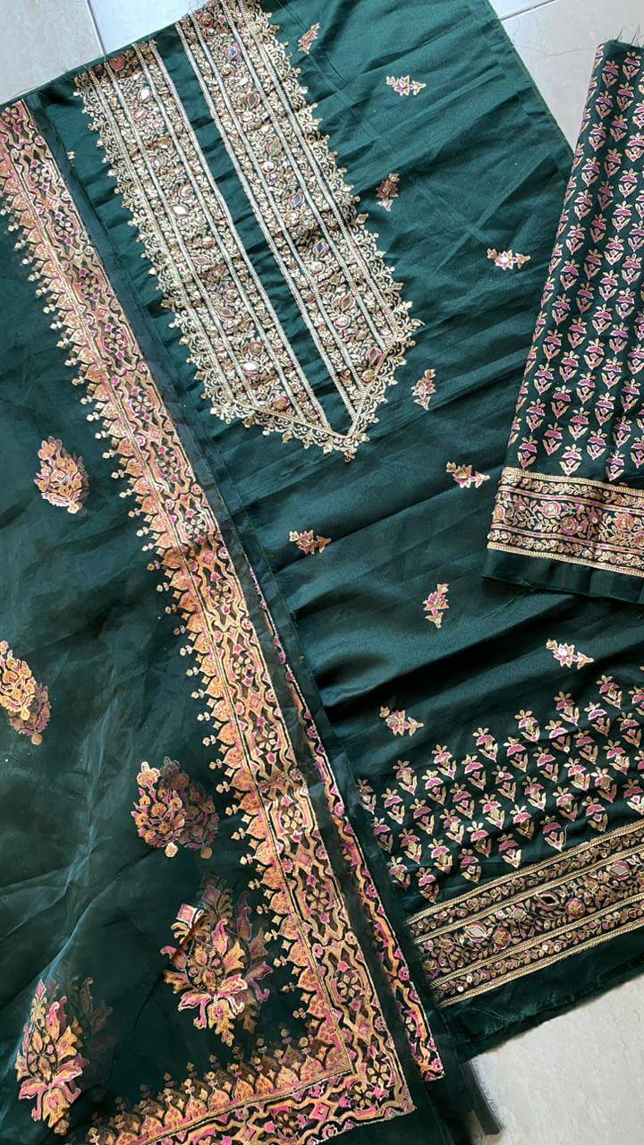 Bottle-Green with Multi Dupatta Raw Silk Set