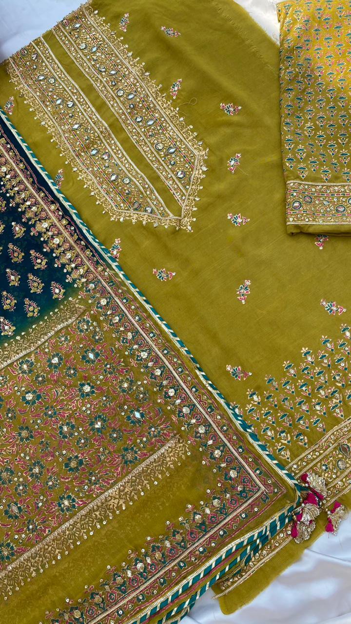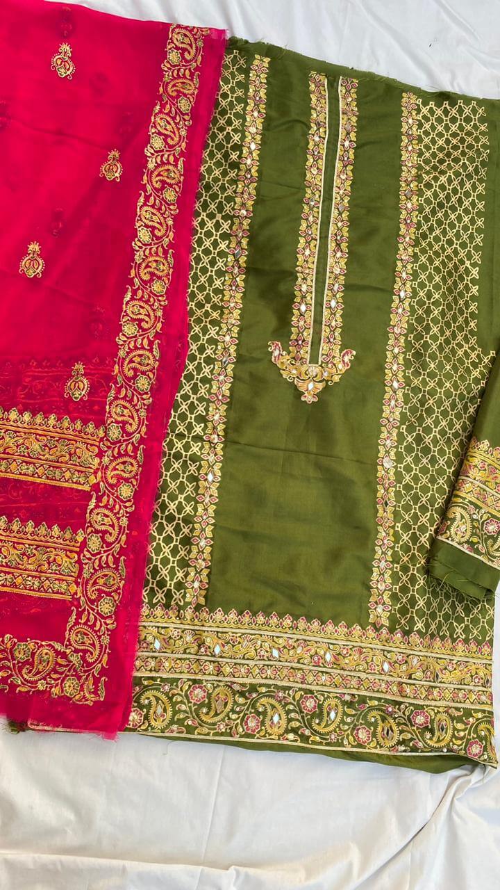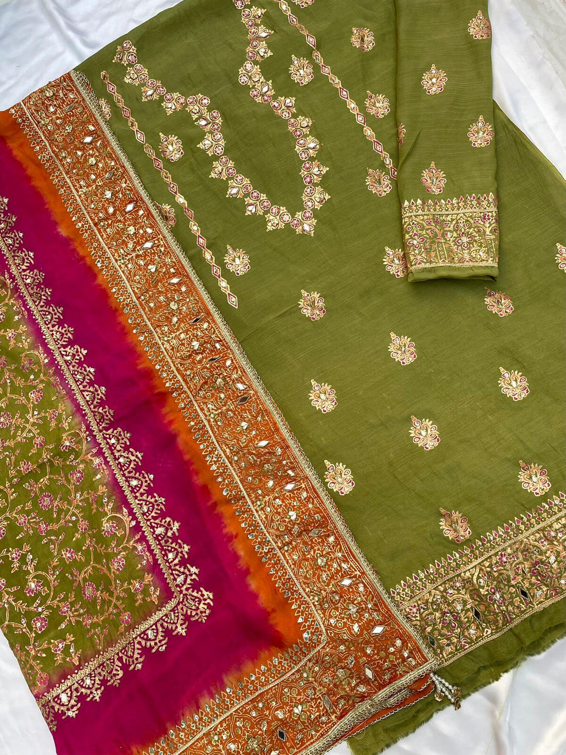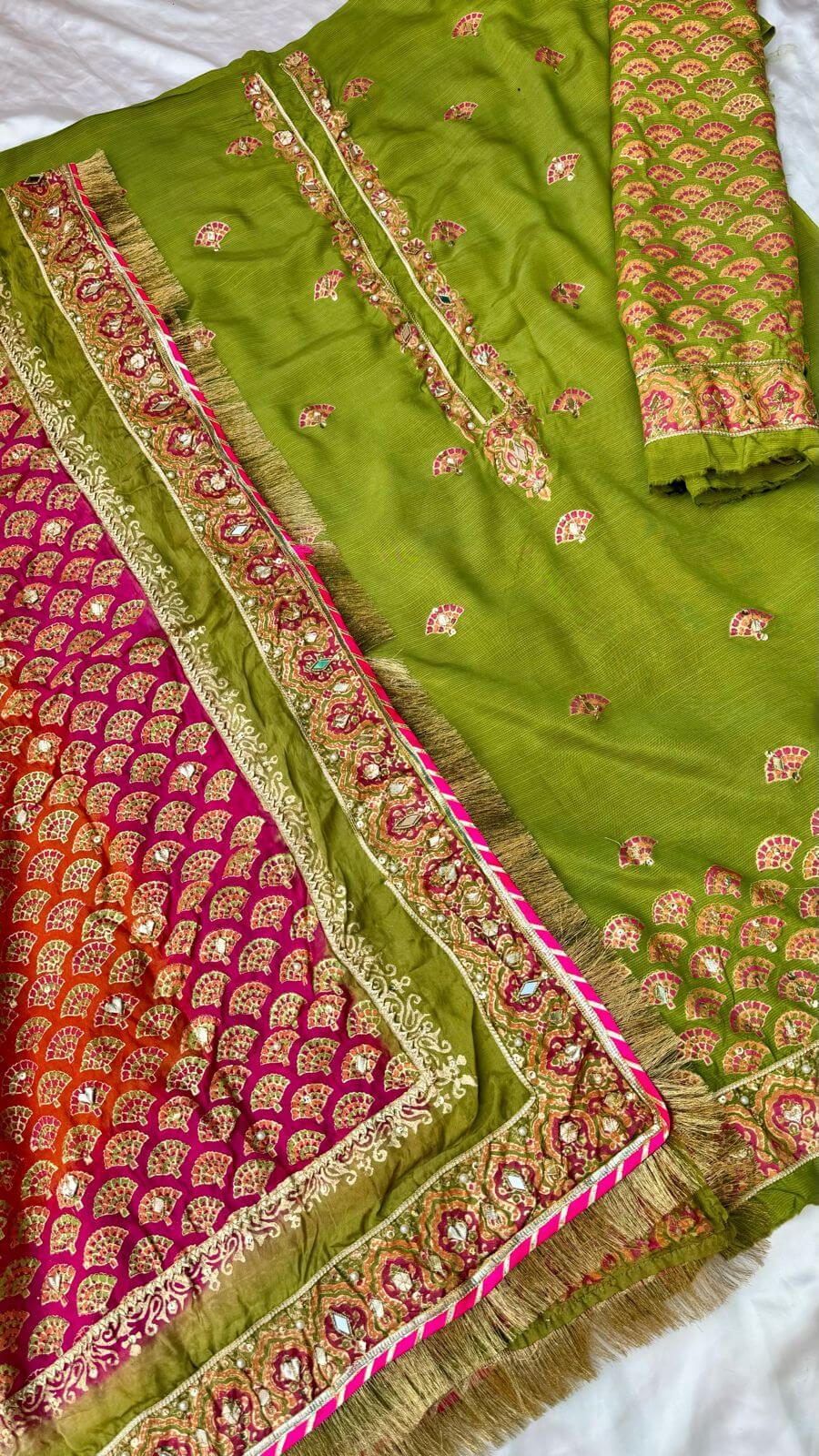 Dhani Green With Two-Shaded Dupatta Embellished Raw Silk Set
