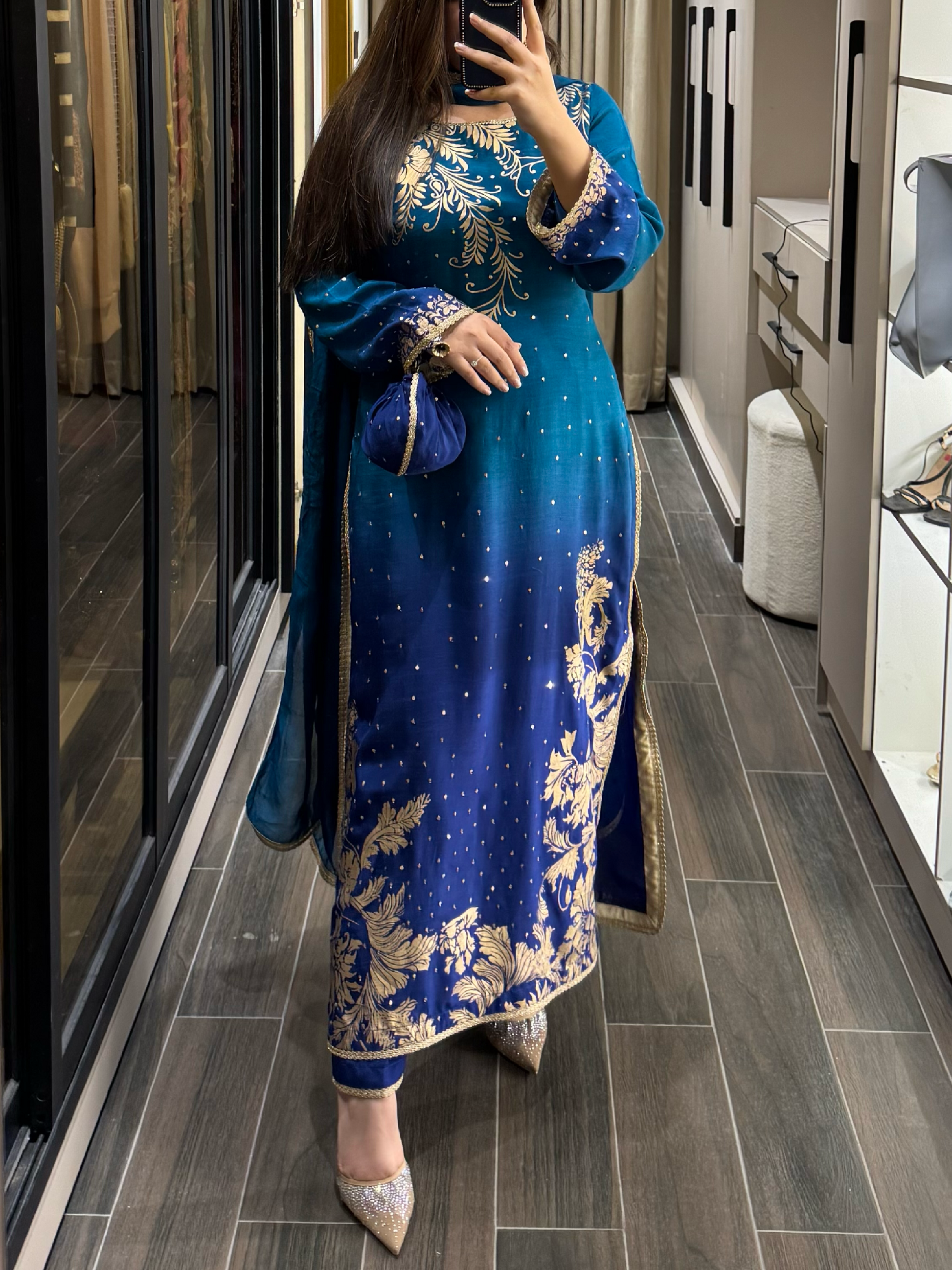 Work Details On Shirt: Hand embroidery, resham work, tilla work & dabka work