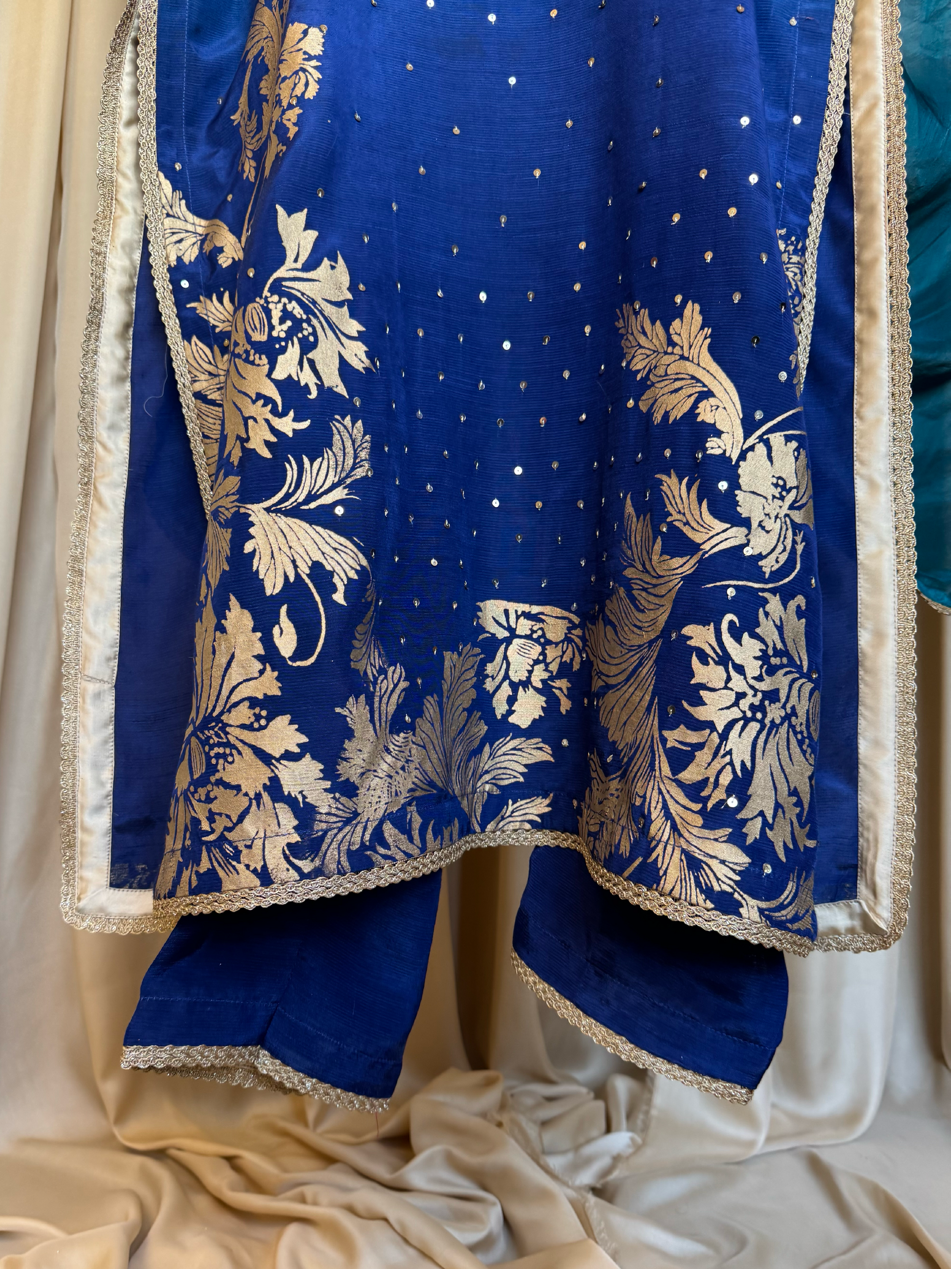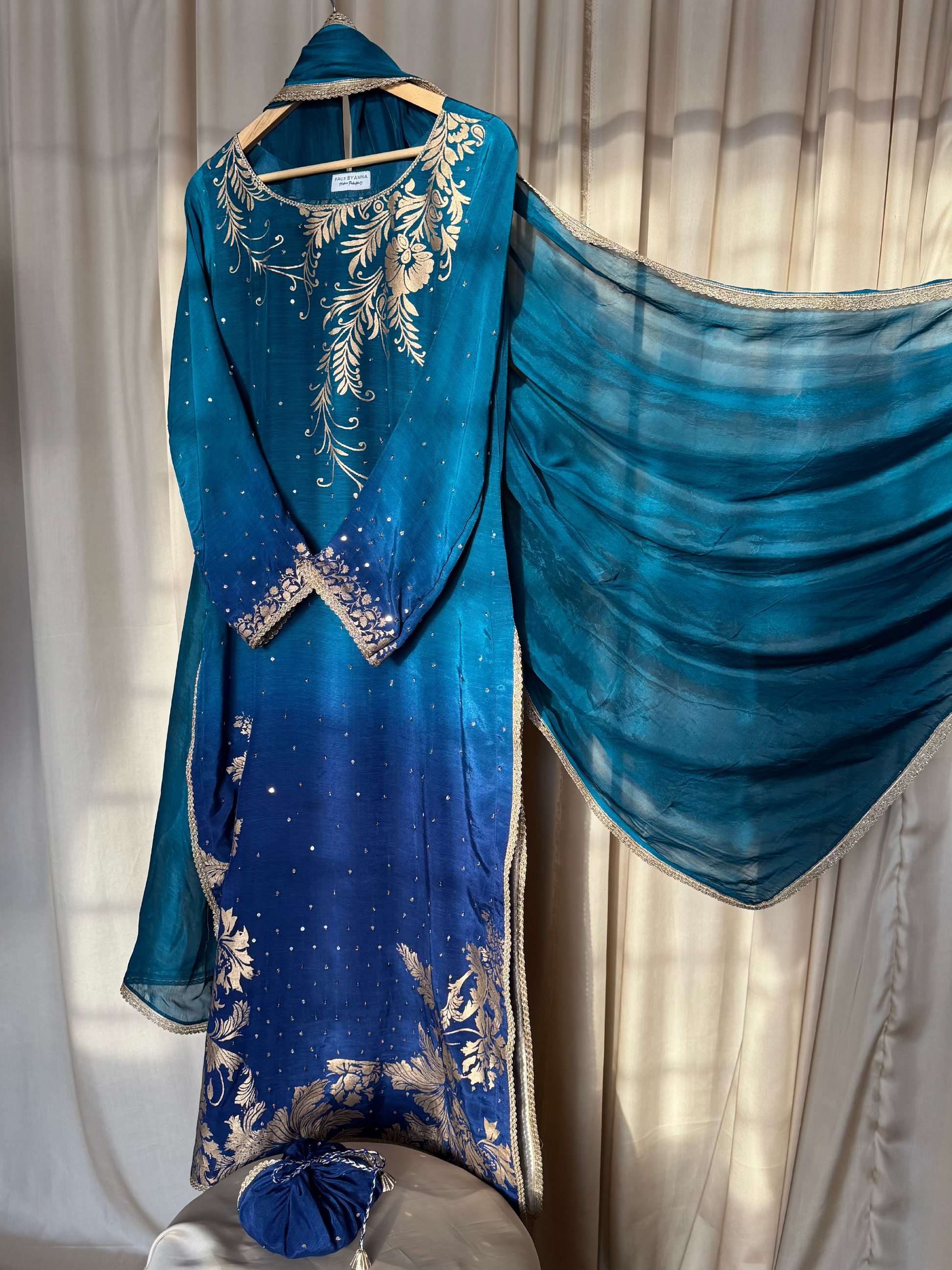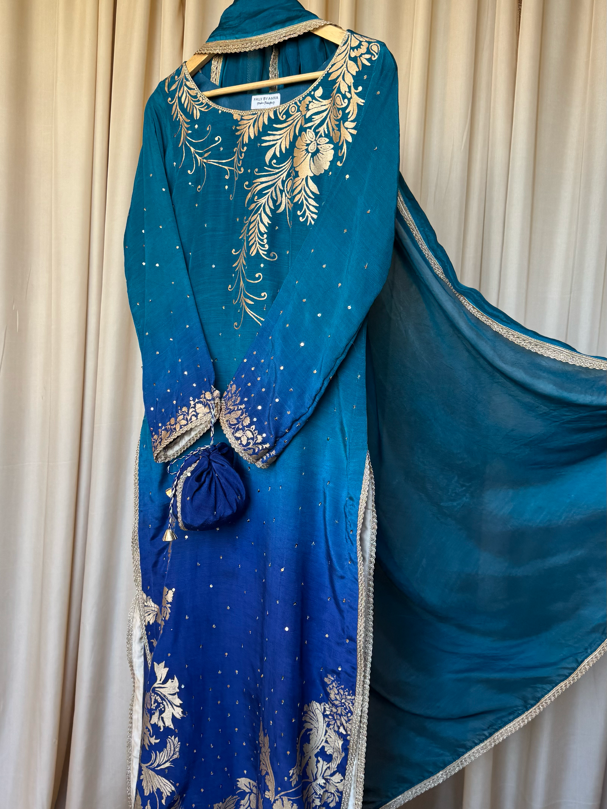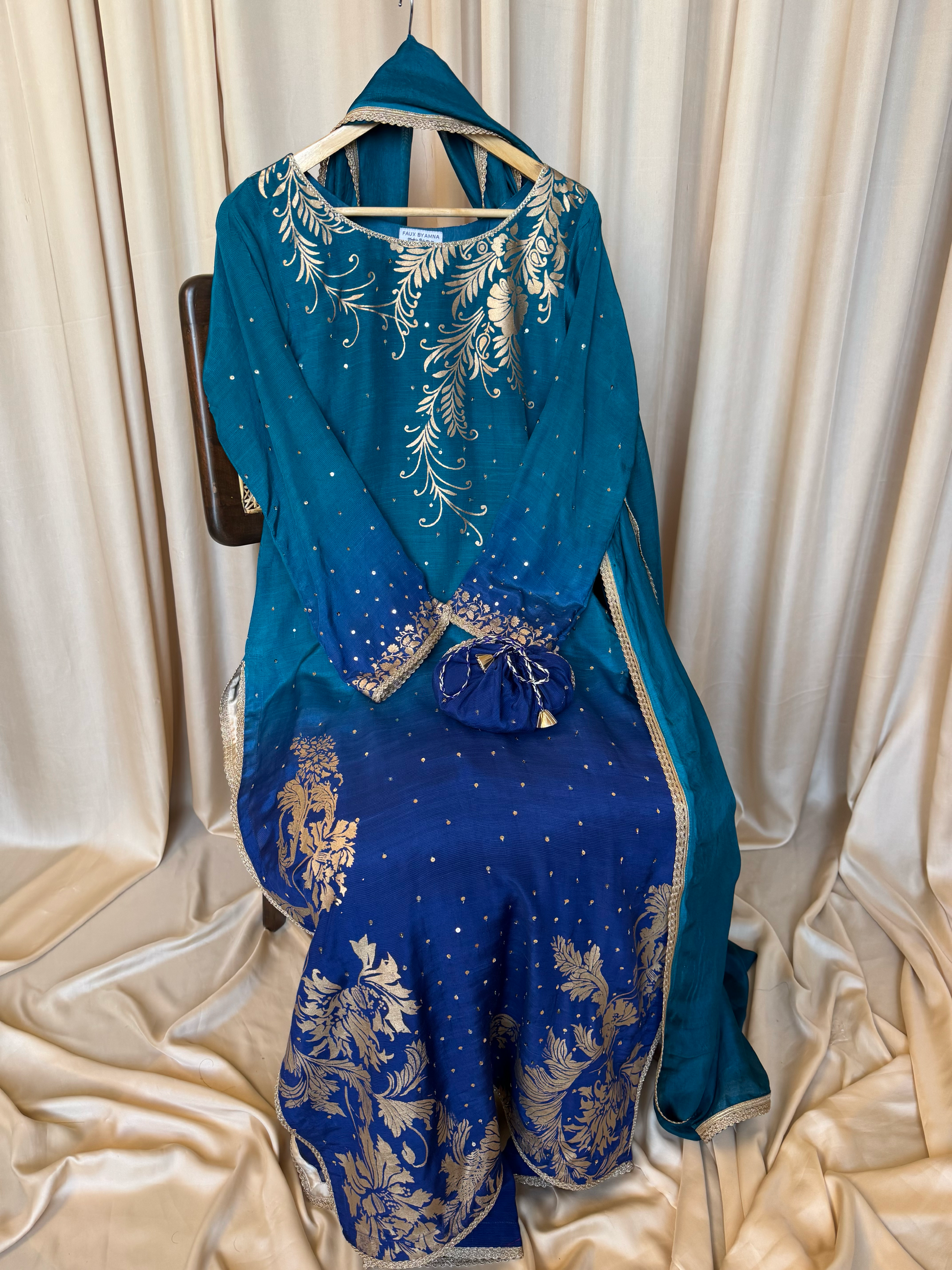 No. of pieces: 3 pc - embellished & screen printed shirt + screen printed sharara pants + screen printed ready to wear dupatta