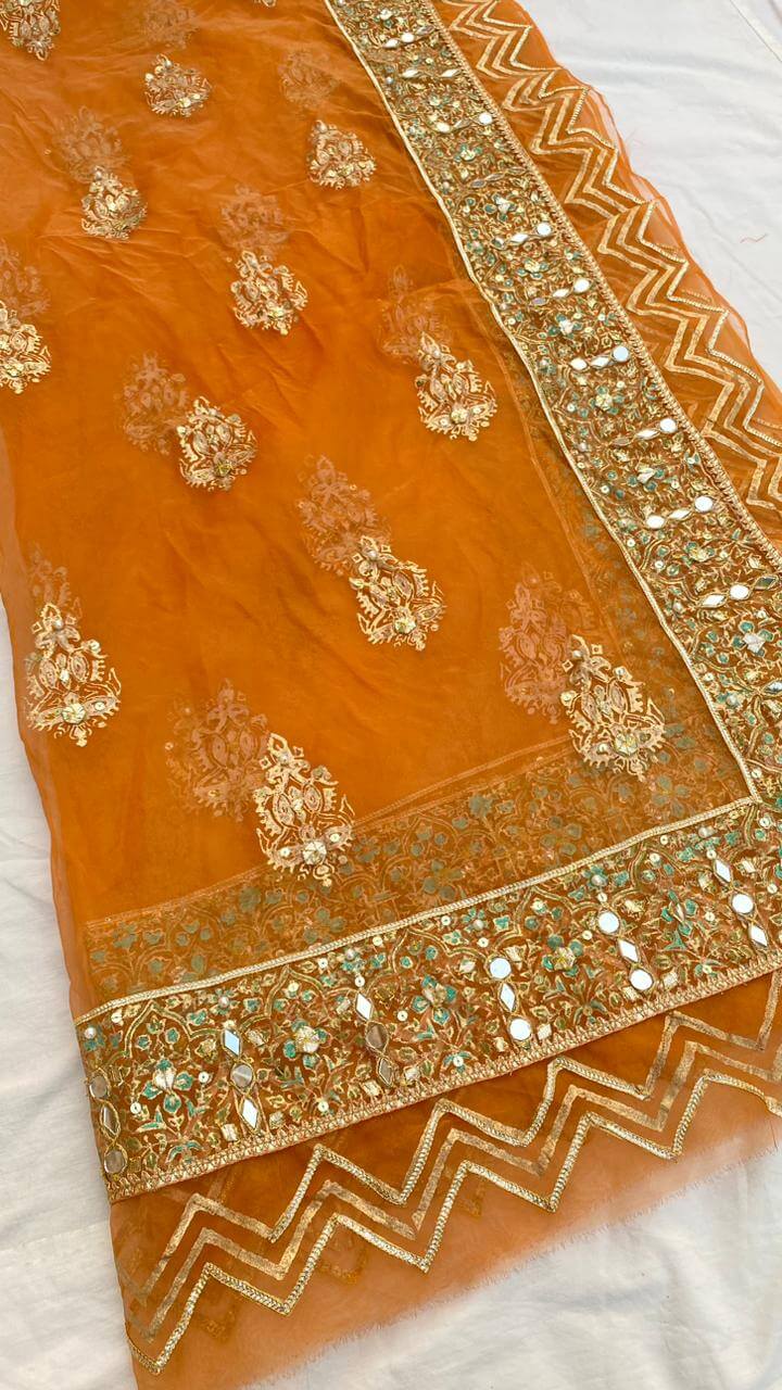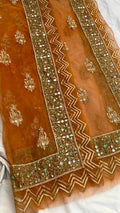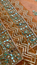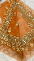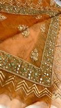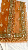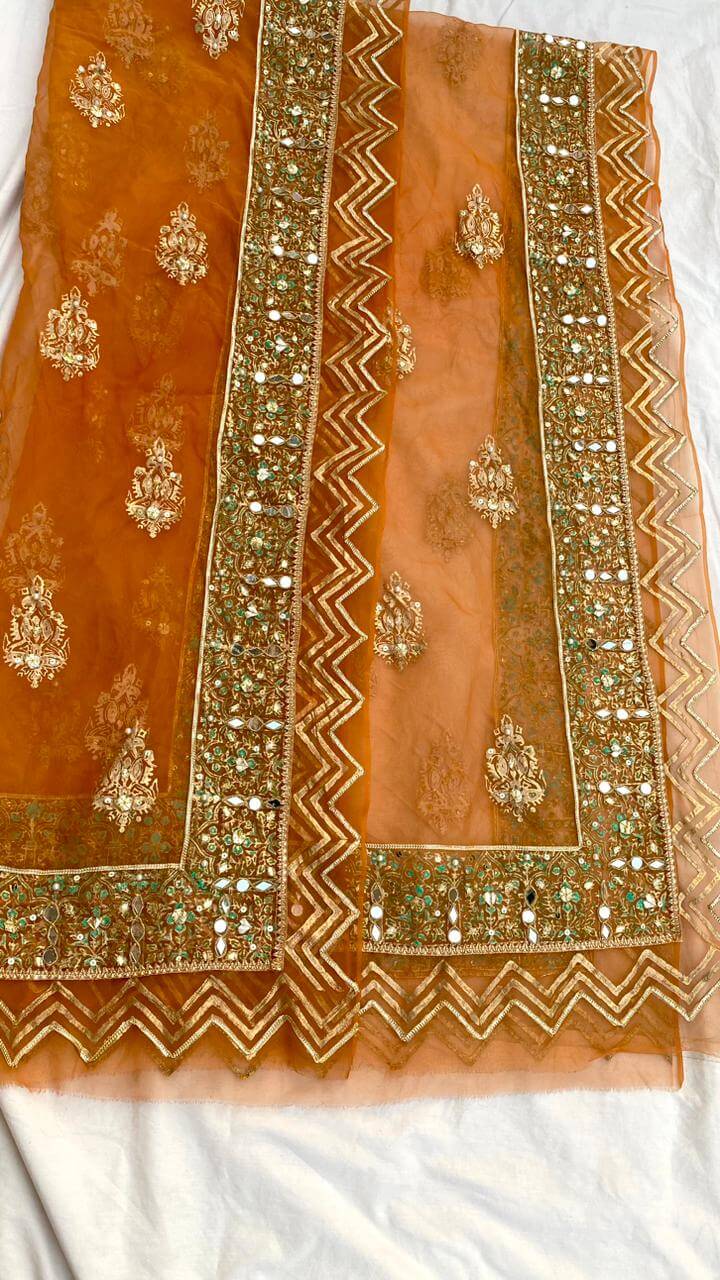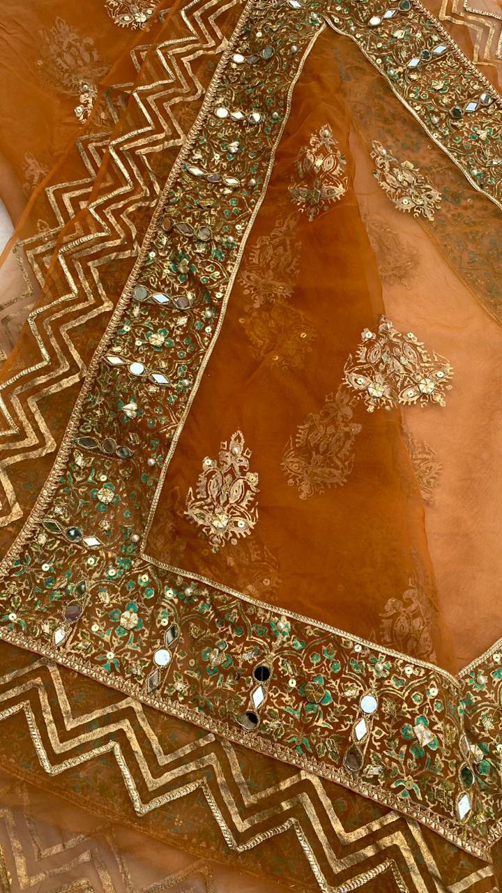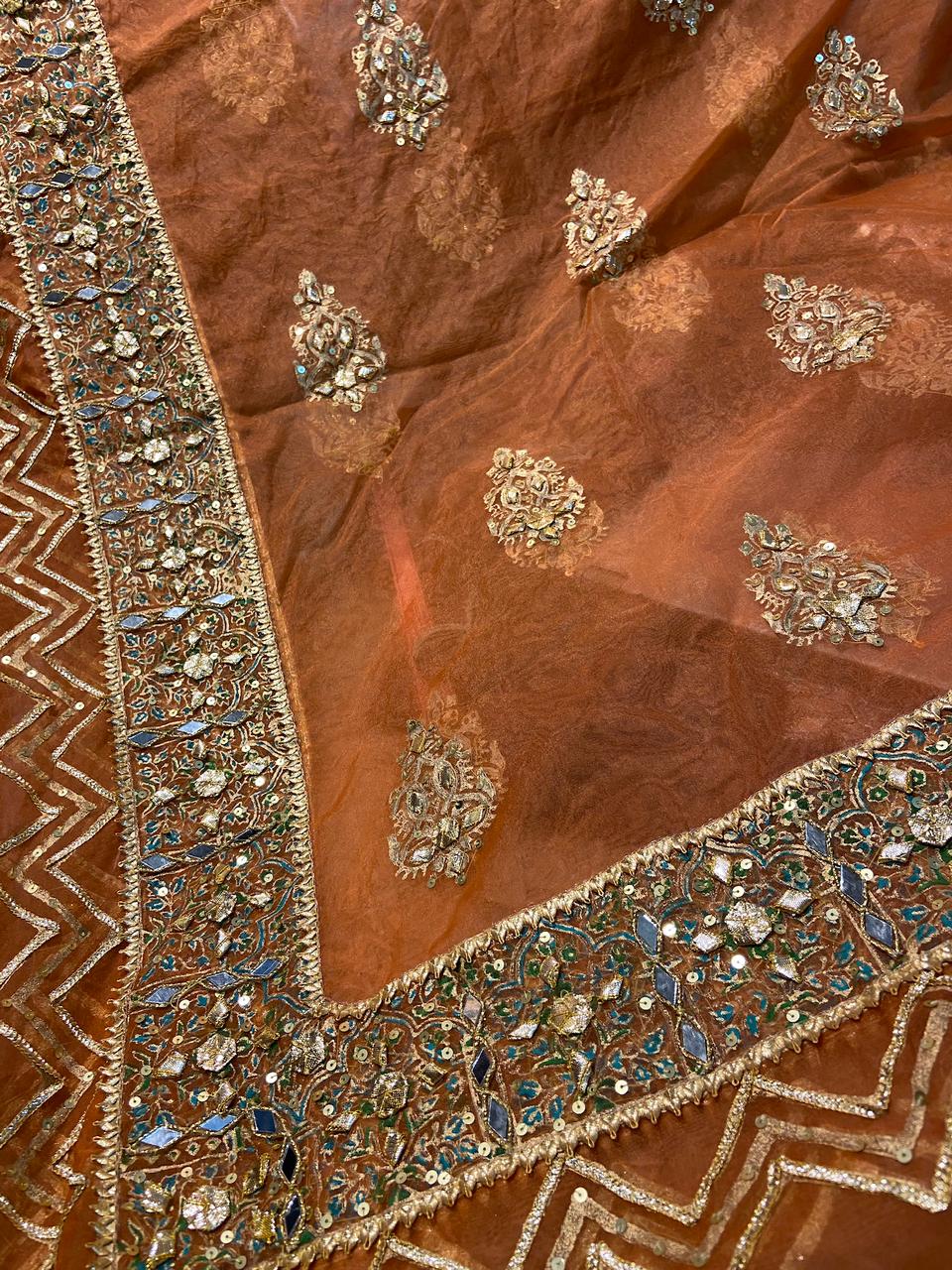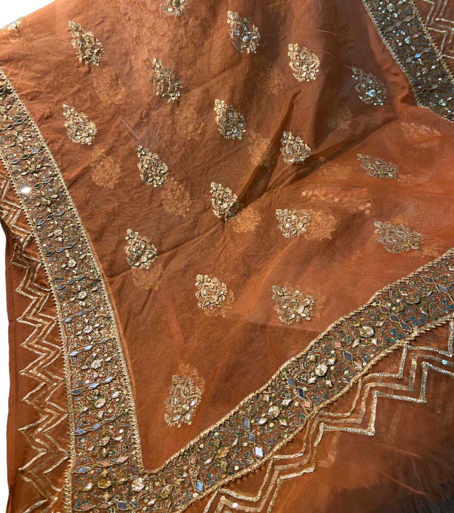 Dazzle in our custom made burnt orange gotta dupatta, perfect for the wedding season. Heavily adorned with gotta work in shades of antique tamba gold motifs, hand made mirrors, dhanak and kharboozay with block printing in opulent tones of gold, blue and army green.