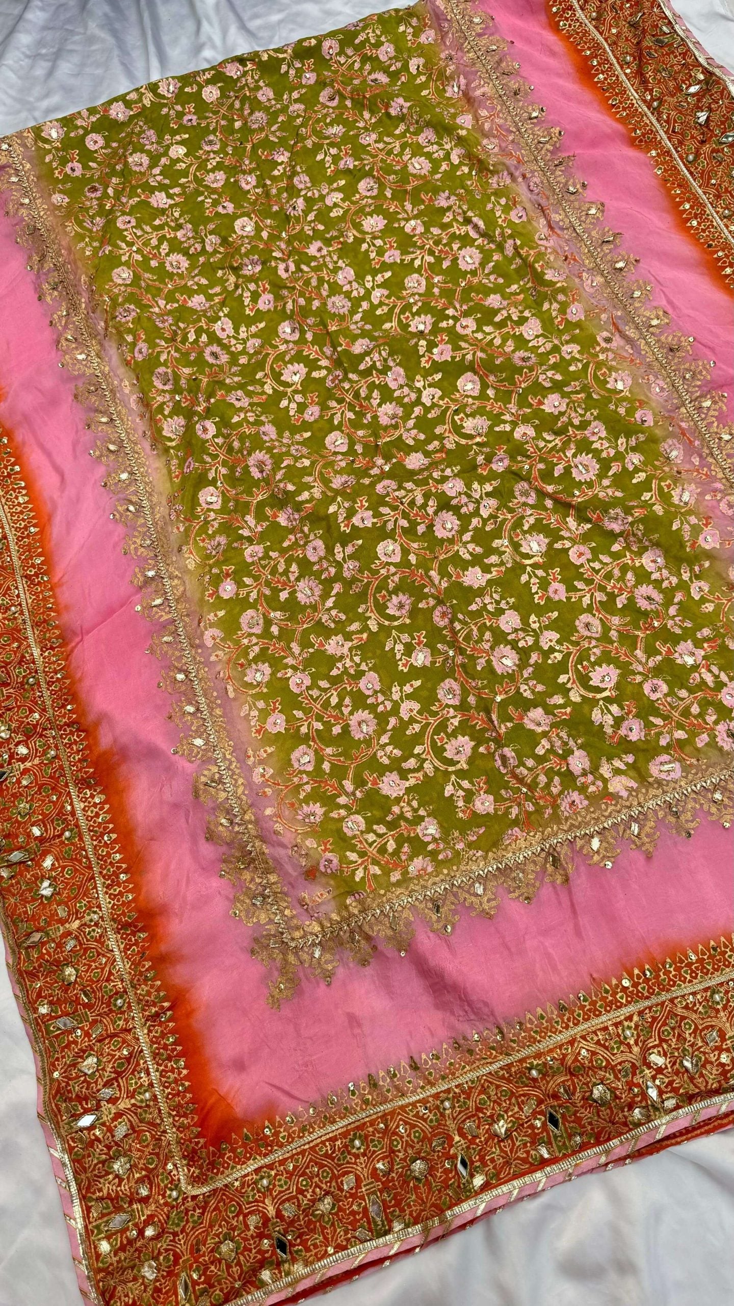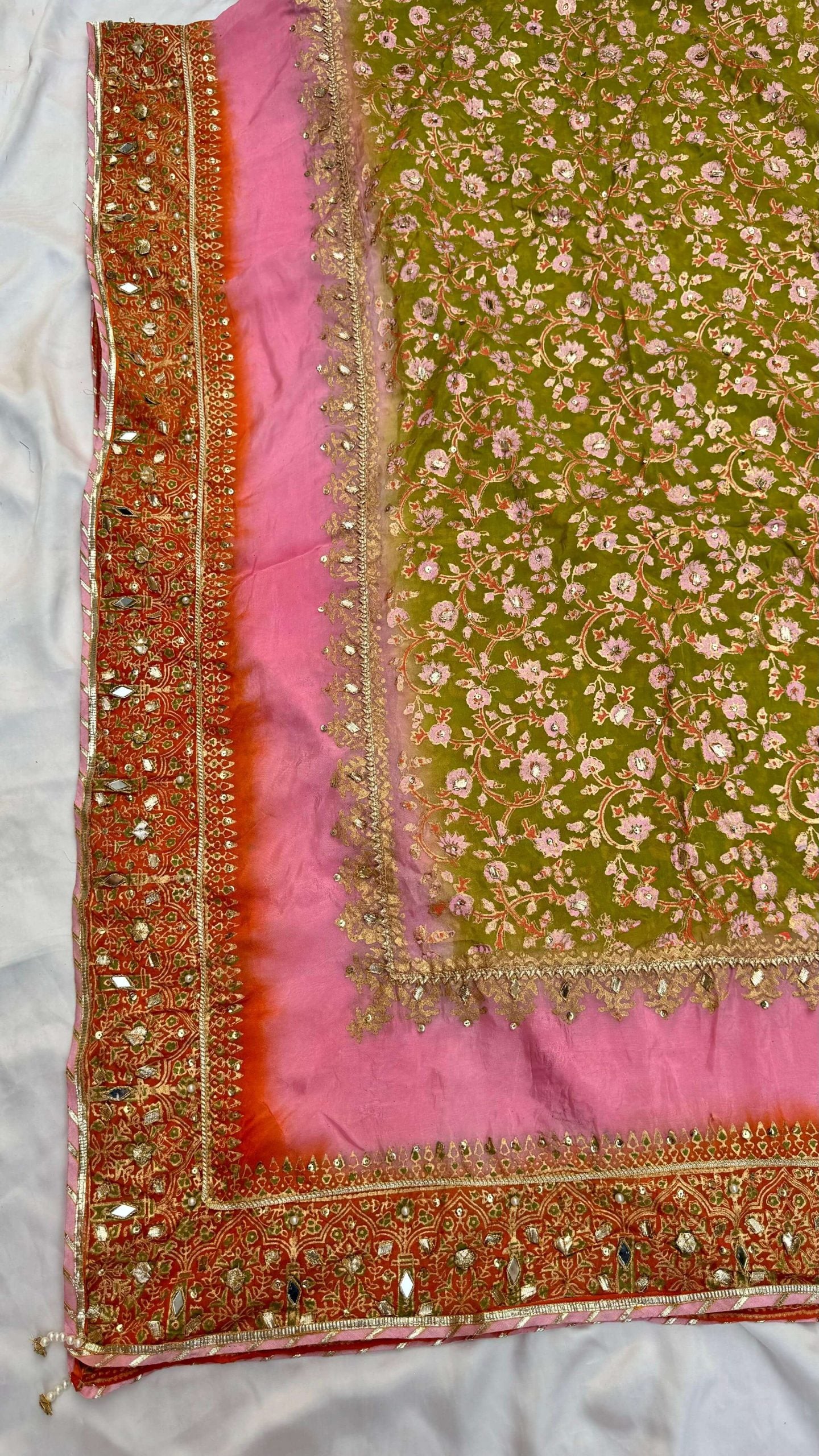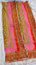 An offering of heaven! A custom-made gotta dupatta, perfect for the wedding season. Heavily adorned with gotta work and antique Tamba gold motifs, handmade mirrors, dhanak, and kharboozay with block printing in opulent tones of gold.