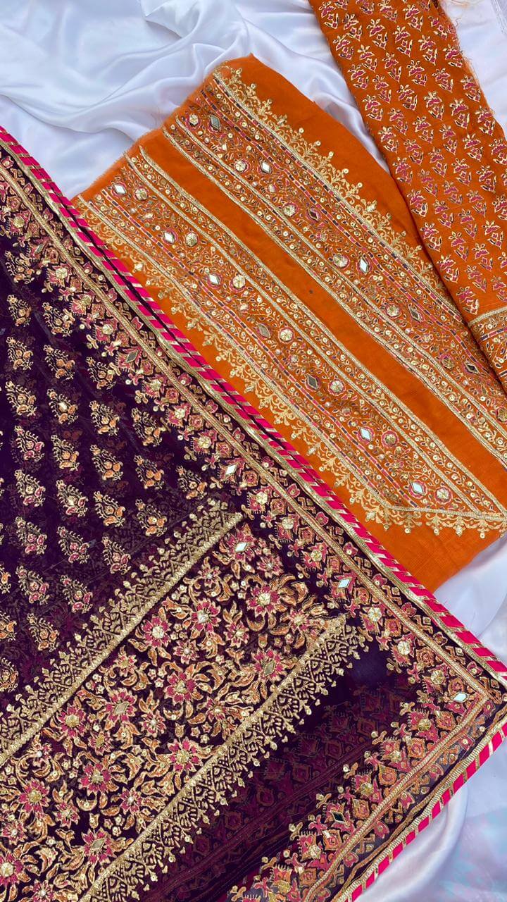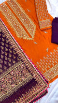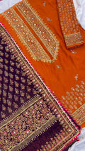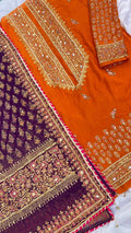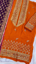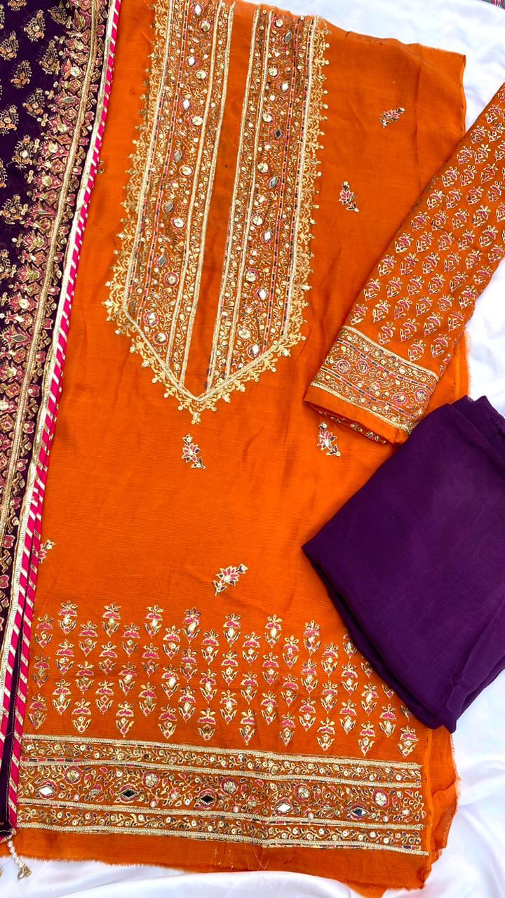 Fabric: Orange Raw Silk Shirt, Purple Raw Silk pants, Purple Embellished Chiffon Dupatta